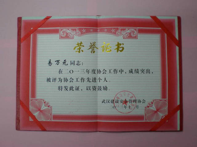 2013年12月31日,在2013年度武汉建设安全管理协会年会上,地建承包公司和武基公司双双荣获2013年度协会工作先进单位荣誉称号,同时,承包公司总经理程立文和武基公司总经理易万元也分别荣获2013年度协会工作先进个人荣誉称号。